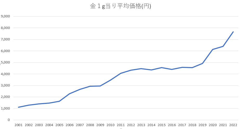金地金投資に関して、金の売買価格が高騰して、20年前から7倍にもなっています。