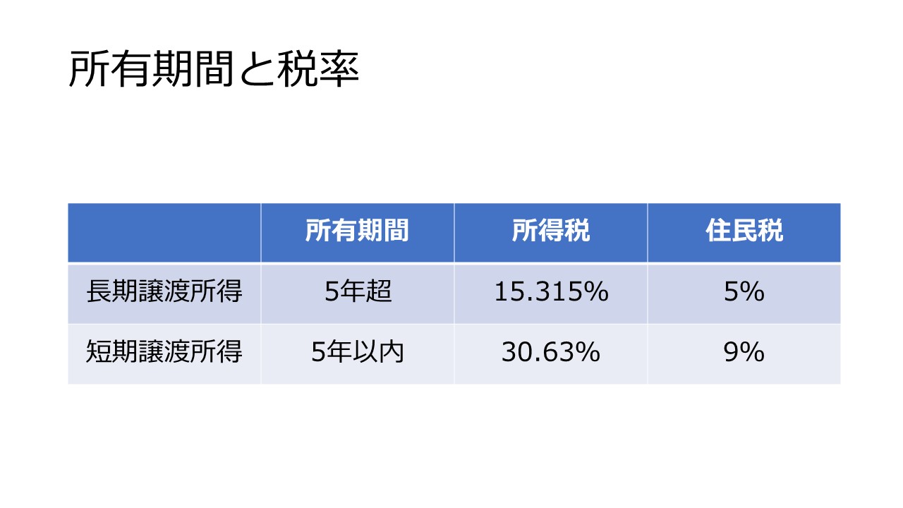 の譲渡所得に税率を乗じて計算されますが、下の表のように所有期間によって税率が変わります。