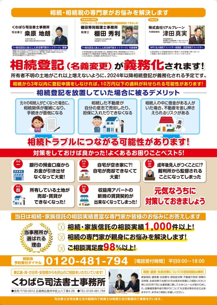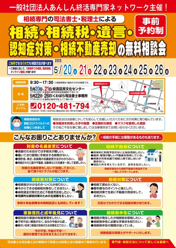 5月20日(土)・21日(日)9時半より安芸区民文化センターにて相続・相続税・遺言・認知症対策・相続不動産売却の無料相談会を開催します。