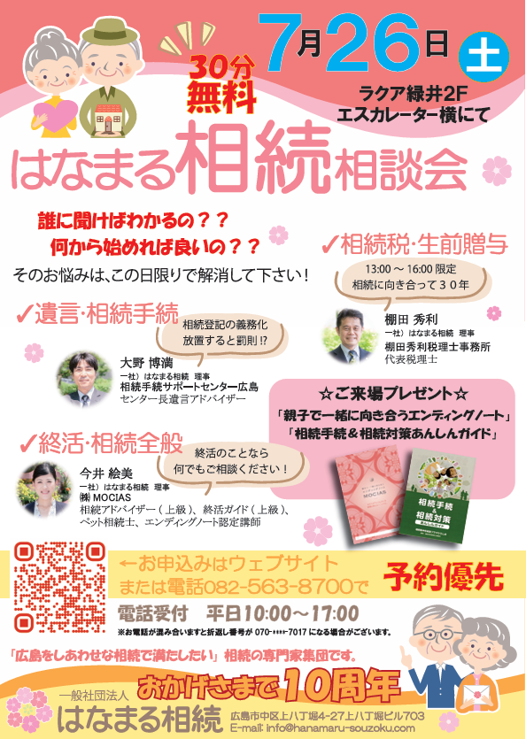 令和7年7月26日(土)10時より16時まで一般社団法人はなまる相続がラクア緑井にて相続相談会を開催します。相続専門税理士は13時から16時まで参加しますので、相続税・贈与税に関するお悩みがおありの方がご気軽にお立ち寄り下さい。