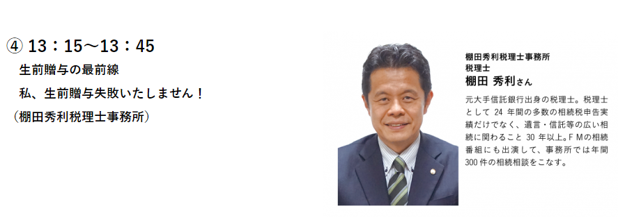 また、私のセミナーも13時15分より「生前贈与の最前線 私、生前贈与失敗いたしません!」のテーマでセミナーも開催します。