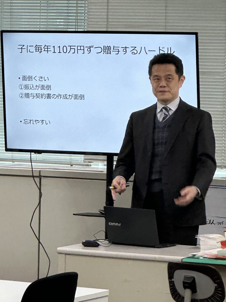 某生命保険会社の支店で、セールスレディさん達を対象に「生前贈与のための生命保険」の解説をしました。「子への110万円贈与の連続継続」は相続税節税の伝統的手段です。