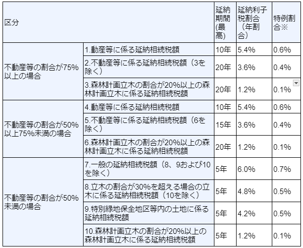 利子税の割合は、相続財産の価額のうちに占める不動産等の価額の割合と、延納期間によって変わります。具体的な利子税の割合は、次のとおりです。